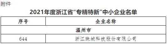 近日,浙江省經(jīng)濟(jì)和信息化廳發(fā)布了《浙江省經(jīng)濟(jì)和信息化廳關(guān)于公布2021年度浙江省“專精特新”中小企業(yè)名單的通知》,浙江珠城科技有限公司成功通過遴選,被認(rèn)定為2021年度浙江省“專精特新”中小企業(yè)。